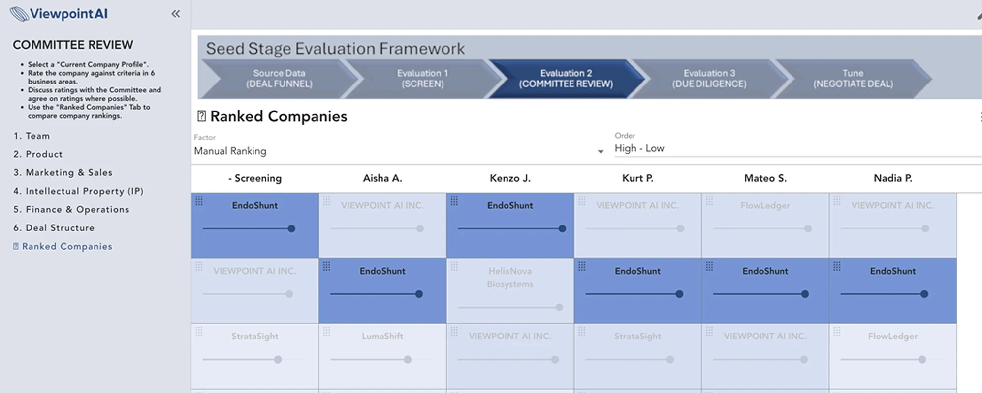 Enable efficient input, scoring, and feedback from all participants to drive collaborative due diligence.
